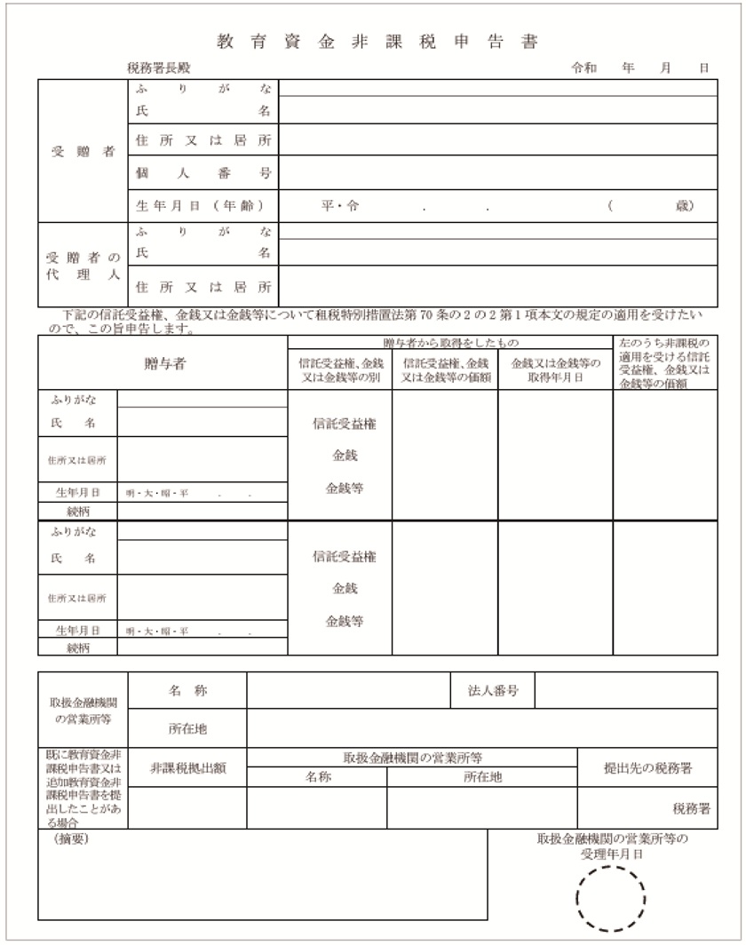 非課税措置を受けるには、金融機関を通じて「教育資金非課税申告書」を税務署に提出する必要があります。