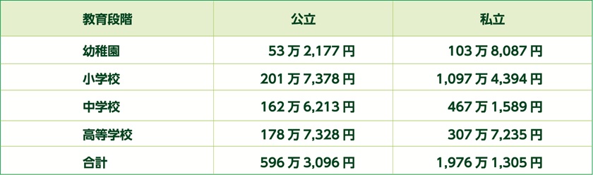 下表は、2023年度に幼稚園から高校までにかかった学習費総額を公立・私立別にまとめたものです。